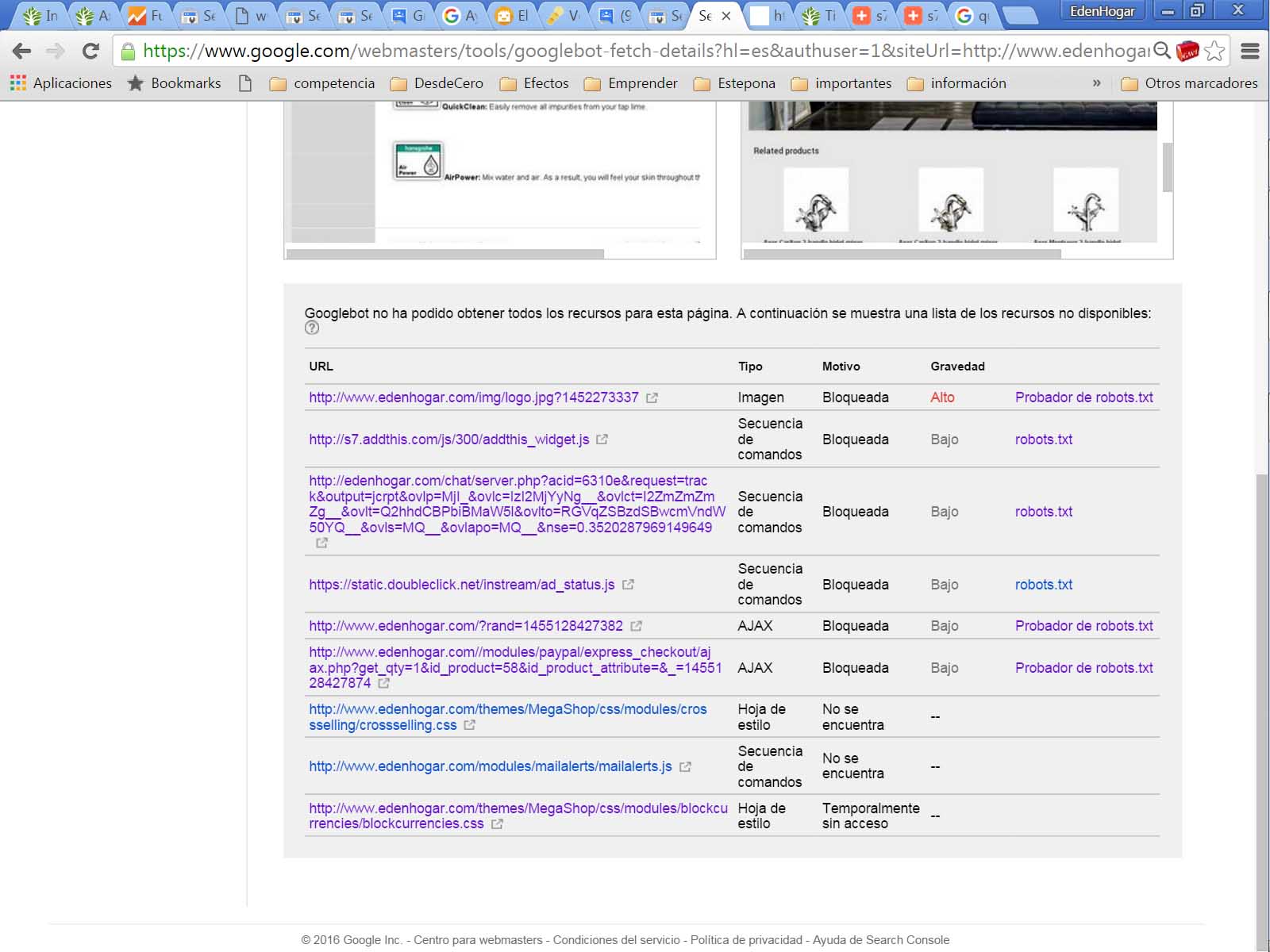 En la parte de Recursos bloqueados de Robot.txt  dice que tengo muchos archivos .CSS bloqueados y por eso las paginas de productos están bloqueadas ... en concreto me parece que la linea robot.txt de bloquea esto es la siguiente: