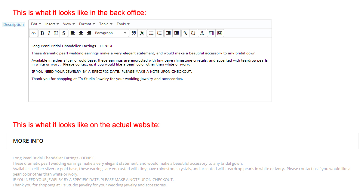 tztudio Posted February 11, 2016 Author Share Posted February 11, 2016 p.s. Here is the source code: <p>Long Pearl Bridal Chandelier Earrings - DENISE</p><p>These dramatic pearl wedding earrings make a very elegant statement, and would make a beautiful accessory to any bridal gown.</p><p>Available in either silver or gold base, these earrings are encrusted with tiny pave rhinestone crystals, and accented with teardrop pearls in white or ivory. Please contact us if you would like a pearl color other than white or ivory.</p><p>IF YOU NEED YOUR JEWELRY BY A SPECIFIC DATE, PLEASE MAKE A NOTE UPON CHECKOUT.</p><p>Thank you for shopping at T's Studio Jewelry for your wedding jewelry and accessories.</p> Link to comment Share on other sites More sharing options...