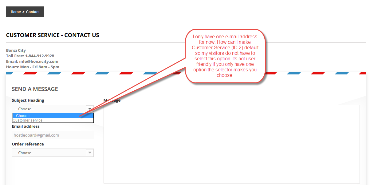 clubbuilder Posted February 13, 2016 Share Posted February 13, 2016 I only have one contact for now (ID 2). Yet my contact form still makes my visitors select this one e-mail address. It doesn't make sense if you only have one contact option that this one e-mail is not already pre-selected. Obviously not user friendly. How can I make my one contact pre-selected. I don't want to remove the selector in case I add more e-mails in the near future. I would assume I modify codeing in mytemplate> contact-form.tpl but I just don't know how to modify this PHP code to get what I want. Here is the code in my contact-form.tpl page for this selector area: <div class="form-group selector1"> <label for="id_contact">{l s='Subject Heading'}</label> {if isset($customerThread.id_contact) && $customerThread.id_contact && $contacts|count} {assign var=flag value=true} {foreach from=$contacts item=contact} {if $contact.id_contact == $customerThread.id_contact} <input type="text" class="form-control" id="contact_name" name="contact_name" value="{$contact.name|escape:'html':'UTF-8'}" readonly /> <input type="hidden" name="id_contact" value="{$contact.id_contact|intval}" /> {$flag=false} {/if} {/foreach} {if $flag && isset($contacts.0.id_contact)} <input type="text" class="form-control" id="contact_name" name="contact_name" value="{$contacts.0.name|escape:'html':'UTF-8'}" readonly /> <input type="hidden" name="id_contact" value="{$contacts.0.id_contact|intval}" /> {/if} </div> {else} <select id="id_contact" class="form-control" name="id_contact"> <option value="0">{l s='-- Choose --'}</option> {foreach from=$contacts item=contact} <option value="{$contact.id_contact|intval}"{if isset($smarty.request.id_contact) && $smarty.request.id_contact == $contact.id_contact} selected="selected"{/if}>{$contact.name|escape:'html':'UTF-8'}</option> {/foreach} </select> </div> <p id="desc_contact0" class="desc_contact{if isset($smarty.request.id_contact)} unvisible{/if}"> </p> {foreach from=$contacts item=contact} <p id="desc_contact{$contact.id_contact|intval}" class="desc_contact contact-title{if !isset($smarty.request.id_contact) || $smarty.request.id_contact|intval != $contact.id_contact|intval} unvisible{/if}"> <i class="icon-comment-alt"></i>{$contact.description|escape:'html':'UTF-8'} </p> {/foreach} {/if} Help would be much appreciated. Link to comment Share on other sites More sharing options...