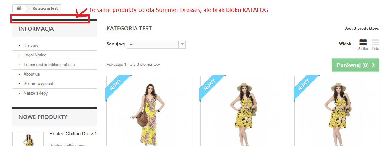 stworzyłam sobie nowa kategorię: 'Kategoria test', i wszystkie produkty 'summer dresses' dodalam do niej, nastepnie dodalam ja do gornego menu, jednakże gdy wchodze do kategorii test - to w lewym panelu nie wyświetla mi się blok "Katalog" - który jest widowczny dla kategorii 'Summer dresses'.
