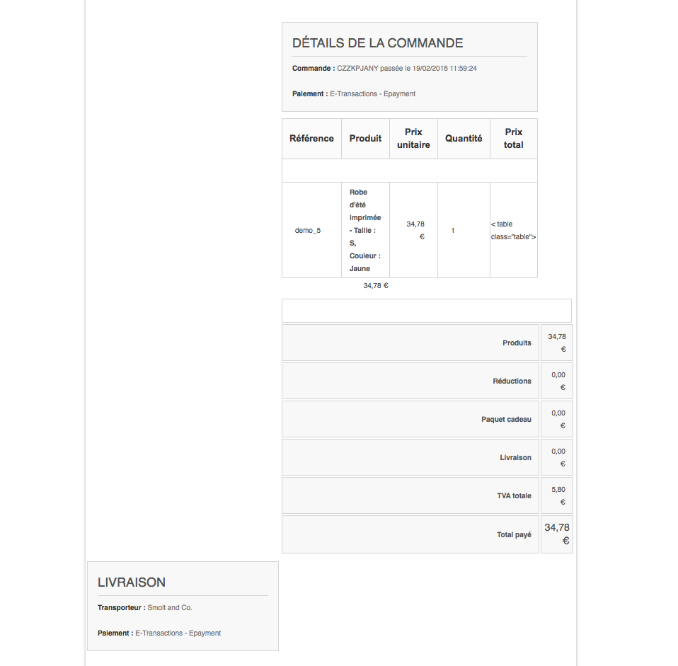 Smolt Posted February 19, 2016 Share Posted February 19, 2016 Bonjour, Je viens d'installer une copie toute fraiche de Prestashop 1.6.1.3 pour tester les modules de paiement. Je rencontre un bug de mise en page sur l'email de confirmation de commande. L'affichage des produits n'est pas correctement interprété à cause d'une erreur de formatage HTML d'une table. Je visualise le mail avec le logiciel Apple Mail. Ci-joint les screeshots de l'erreur : ps-mail-bug1.png : le résultat de l'email dans Apple Mail. Au niveau du prix total du produit, on voit la <table class="table"> qui pose problème. ps-mail-bug1.png : le code source du mail dans un éditeur de texte. Lignes 265 et 266, on voit des sauts de ligne qui ne devrait pas y être. Link to comment Share on other sites More sharing options...