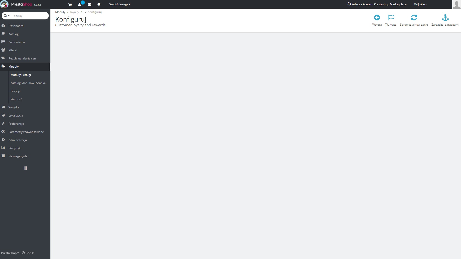 Witam, mam problem z modułem Customer loyalty and rewards. Po wejściu w konfiguracje, mam puste pole . Jak to naprawić? Wersja Prestashop 1.6.1.3