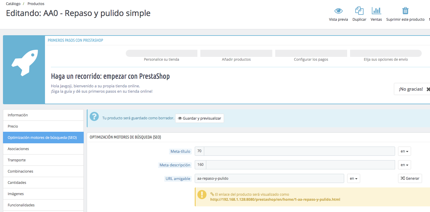 Enrique Gómez Posted March 8, 2016 Share Posted March 8, 2016 Os muestro imágenes. El producto no esta activado y tampoco esta visible en tienda. Sin embargo, en el apartado de Seo por defecto ha creado un index. Si esta desactivado, entonces no me preocuparía. El apartado SEO a que te refieres es la url amigable para acceder al producto, que por defecto se saca del nombre del mismo, no se ha creado ningun index ni simillar Realmente si esta url no esta siendo usada en ningún sitio de la web (menú, listados) ni en el sitemap (es decir que si no tienes la url no hay forma de llegar a esa página), diria que google no indexará esas páginas. 1 Link to comment Share on other sites More sharing options...