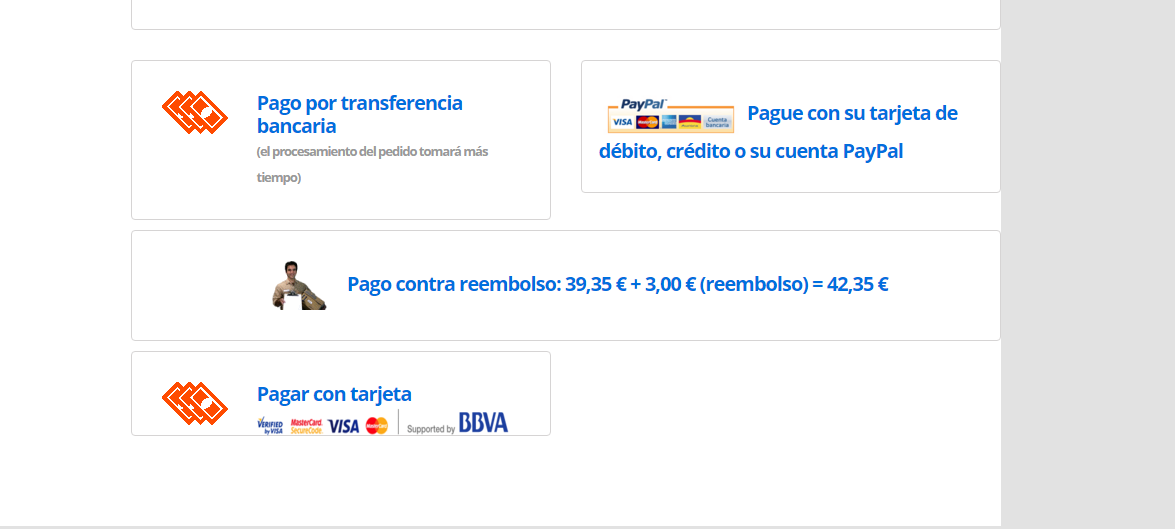joseantgv Posted February 26, 2016 Share Posted February 26, 2016 Hola a todos, tengo un problema con los métodos de pago cuando los clientes van ha realizar el pago, y es que cada método de pago tiene un tamaño distinto y tampoco están bien ordenados uno debajo de otro u al lago. ¿Sabe alguien a que se debe o como configurar esto? Graciassssss Deberías modificar la plantilla de cada módulo para que todos tengan el mismo tamaño. Quieres que te ocupen toda la pantalla o bien sólo la mitad? Link to comment Share on other sites More sharing options...