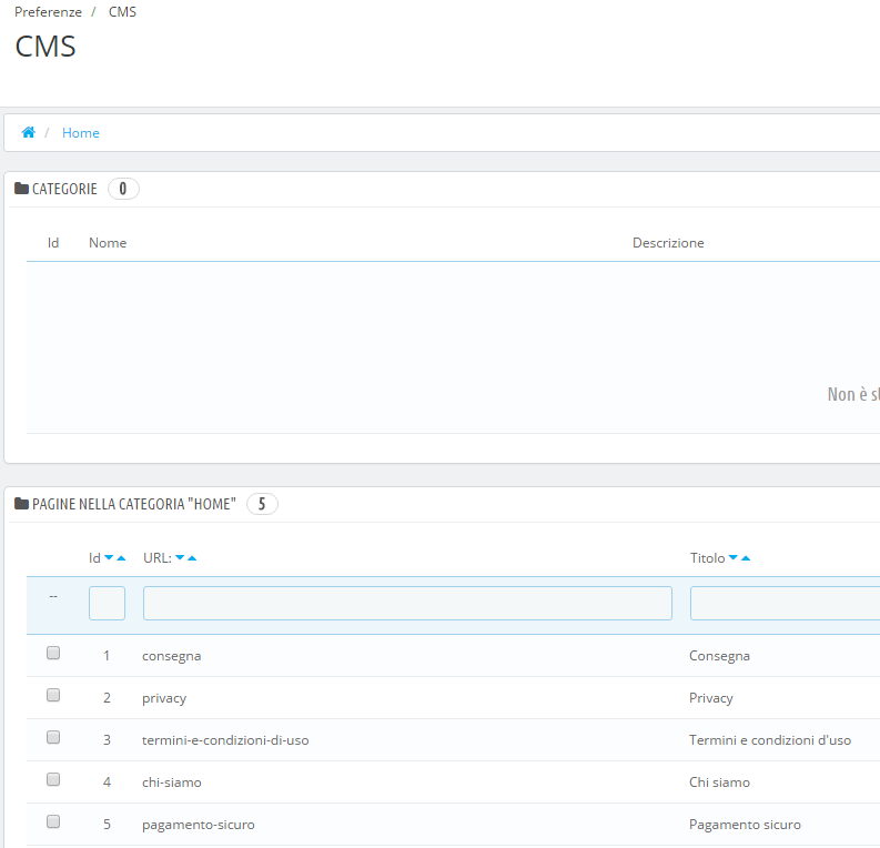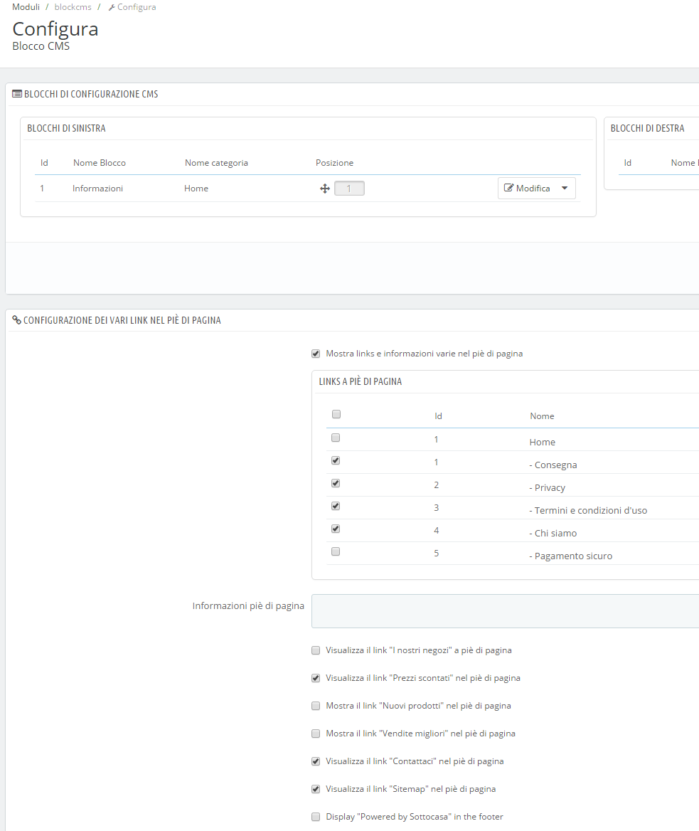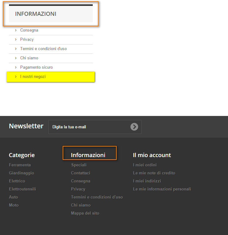 sergio70 Posted February 26, 2016 Share Posted February 26, 2016 (edited) Non riesco a capire il blocco delle informazioni.Praticamente ce ne sono 2, quello che compare nella colonna di sinistra quando visualizzo solo una categoria di prodotti e quella nel footer. Devo modificare quella nella colonna sinistra ma non so dove mettere mani. Da BO, sono andato in preferenze->CMS e vedo i collegamenti che vedo nella colonna di sinistra ma vedo il link "I nostri negozi" che da BO non c'é e mi piacerebbe toglierlo oppure modificarlo visto che punta a Google Maps in mezzo al mare ma non alla mia posizione. Quindi o lo tolgo o riesco a modificare sia la scritta che il link grazie Edited February 26, 2016 by sergio70 (see edit history) Link to comment Share on other sites More sharing options...