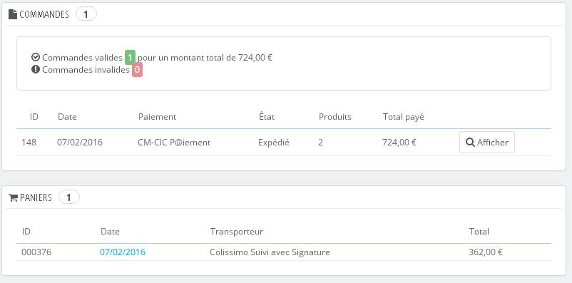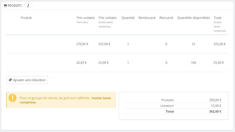 LoicCDIP Posted March 1, 2016 Share Posted March 1, 2016 Bonjour à tous ! Je fais appel à vous car je crois avoir remarqué un problème dans l'affichage des informations d'un client. Ce client, tout nouveau a réalisé une commande avec 2 articles, pour un total de 362,00 € TTC. La facture, la commande, les PDFs, tout est OK. En revanche, quand je vais regarder le compte du client, là où je peux voir ses paniers, ses commandes, ses groupes, la zone où se trouve les commandes est problématique: Pour la même commande que j'ai cité ci-dessus, j'ai un total de 724,00 € TTC, toujours avec un quantité de 2 articles. Pas besoin d'être devin, 362 * 2 = 724 €, mais la commande à 362 € comporte un article à 325 €, et un autre à 25 €. Je ne crois pas que cette commande ai été trifouillé, si vous avez une idée, dites moi PS: Ce n'est pas bloquant, juste dérangeant, la facture et la commande restent OK ! PS: La banque a reçu un paiement de 362,00 €, encore là, aucun problème PS: En PJ les 2 écrans Merci du support ! Loïc LE MEUT Link to comment Share on other sites More sharing options...