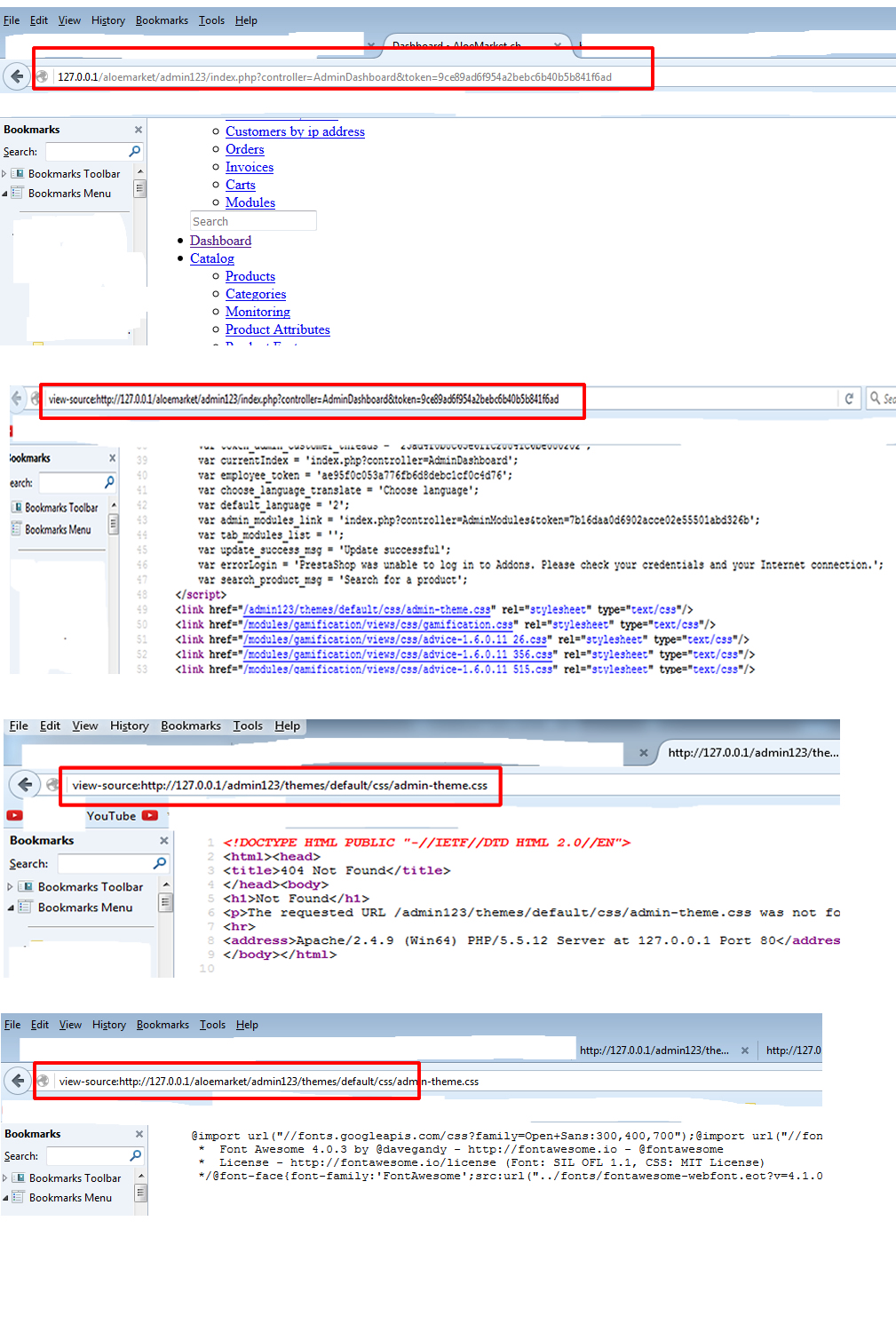 Mufdo Posted March 2, 2016 Share Posted March 2, 2016 Hello, I move my Prestashop website (File + database) to local environment I make this move many times ( ps_configuration table : 127.0.0.1, ps_shop_url : /aloemarket/, changing the settings.inc ) Everything work database, login, product update , all but with this web site I have a CSS problem : When I display the page source and click on one of this links , I got this message : </script> <link href="/admin123/themes/default/css/admin-theme.css" rel="stylesheet" type="text/css"/> <link href="/modules/gamification/views/css/gamification.css" rel="stylesheet" type="text/css"/> .... *********** Message displayed in the browser **************************** <!DOCTYPE HTML PUBLIC "-//IETF//DTD HTML 2.0//EN"> <html><head> <title>404 Not Found</title> </head><body> <h1>Not Found</h1> <p>The requested URL /admin123/themes/default/css/admin-theme.css was not found on this server.</p> <hr> <address>Apache/2.4.9 (Win64) PHP/5.5.12 Server at 127.0.0.1 Port 80</address> </body></html> ... *************************************** Url in a browser after clicking the link above : view-source:http://127.0.0.1/admin123/themes/default/css/admin-theme.css When it function properly view-source:http://127.0.0.1/aloemarket/admin123/themes/default/css/admin-theme.css I find the problem : the /aloemarket/ is missing in the Url -- so the admin-theme.css file can not be loaded and all other file as well (gamification.css, advice-1.6.0.11_26.css, etc) Someone has an idea ? Thanks for your help Botchan Link to comment Share on other sites More sharing options...