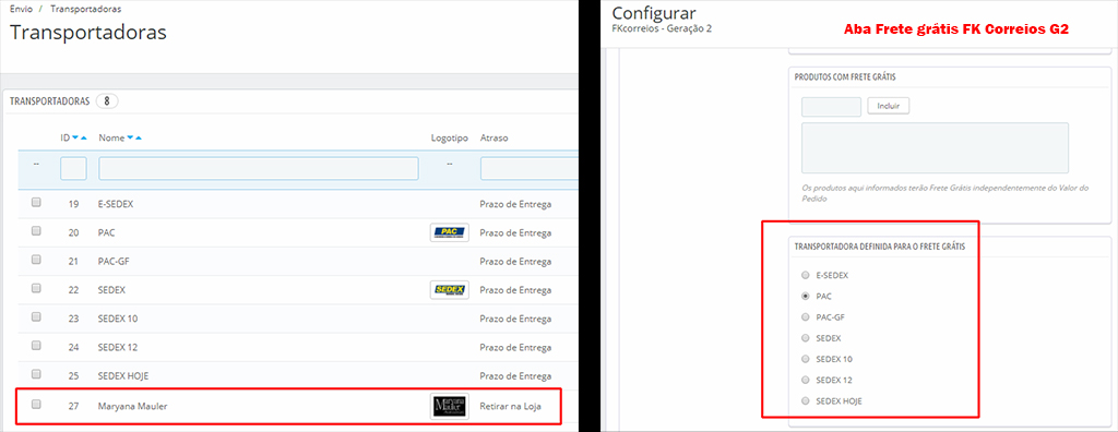 Chinattack Posted April 11, 2018 Share Posted April 11, 2018 On 27/03/2016 at 10:20 PM, lessander melo said: resolvido consegui configurar a faixa de CEP da minha cidade no módulo fk na opção frete grátis, e funcionou perfeitamente. obrigado a ajuda no forum. resolvido Como conseguiu? Aqui eu consigo configurar a faixa de cep no Módulo FKCorreios G2 porém quando vou escolher a transportadora de frete grátis ele não me apresenta esta transportadora. Somente as opções dos correios. No prestashop criei a transportadora. Vide imagem. Link to comment Share on other sites More sharing options...