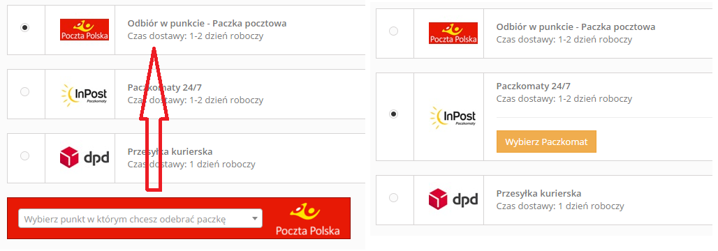 AlwinKolano Posted March 12, 2016 Share Posted March 12, 2016 (edited) Od niedawna używam modułu Pana Michała Mleczko, generalnie moduł działa lecz ma kilka wad z którymi niestety nie mogę sobie poradzić i chyba autor też, więc może ktoś z Was go przerobił aby był bardziej intuicyjny i który będzie działał bez problemów ? Generalnie chodzi o to aby uniemożliwić złożenie zamówienia bez wybranego punktu lub zmusić kupującego do jego wybrania. Pierwszy problem, nie wybranie punktu skutkuje wyświetleniem komunikatu "Czy na pewno chcesz opuścić stronę" z podświetlonym domyślnym przyciskiem "Opuść tę stronę", który sugeruje i tak się niestety dzieje. Kolejny problem, to po wybraniu "Odbioru w punkcie" podobno nie wyskakuje mapka wyboru punktu, u mnie ta mapka pokazuje się za każdym razem (testowałem to na różnych przeglądarkach), ale kto wie co tam kupujący mają w swoich komputerach. Tak, więc chciałbym przenieść formularz który pojawia się na samym dole sposobów dostawy, do okienka odbioru w punkcie tak jak jest to w przypadku wyboru paczkomatu. Zobrazowałem to na poniższym obrazku. Czy ktoś z Was korzysta z tego modułu i może pomóc ? Edited March 12, 2016 by AlwinKolano (see edit history) Link to comment Share on other sites More sharing options...