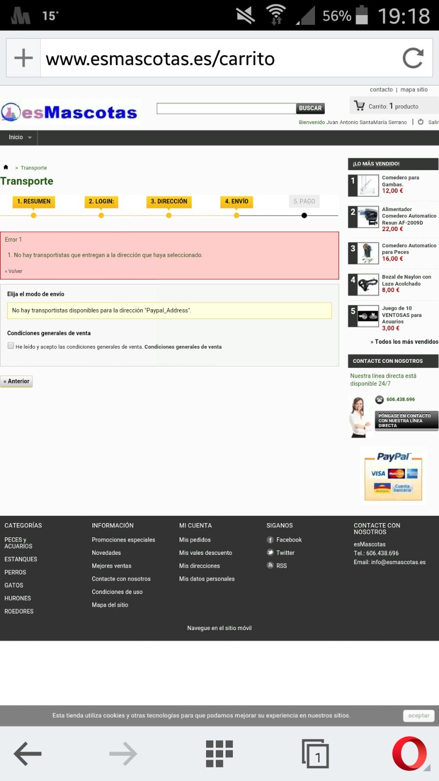 sconav Posted March 12, 2016 Share Posted March 12, 2016 Hola,Tengo en la tienda prestashop instalado el modulo checkout de paypal. El problema es que cuando se realiza el pedido utilizandolo, en el paso nº4 (eliga trasnportista) da un error de "No hay transportistas diponibles para la direccion paypal_Address". Utilizo la version 1.5.6.2 y la version del modulo paypal es la 3.10.2Si se utiliza paypal de la forma tradicional (alta cliente, etc) funciona correctamente.Adjunto pantallazo del movil en el archivo adjuntoHe probado a desactivar la opcion en el modulo paypal, pero en la version movil sigue apareciendo ??.La unica opcion que he encontrado es desactivar tambien el tema movil.La tienda es: http://www.esmascotas.es ¿alquien puede ayudarme? Saludos Link to comment Share on other sites More sharing options...