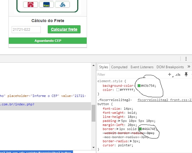 Fabio Bomba Posted March 16, 2016 Share Posted March 16, 2016 (edited) Boa noite!Estou com uma dúvida muito grande e até o momento não consegui resolver.Preciso alterar a cor dos botões CALCULAR FRETE, tanto na página do produto quanto no resumo do carrinho.Também preciso alterar a cor do AGUARDANDO O FRETE, tanto na página do produto quanto no resumo do carrinho. Estou usando o módulo FKCORREIOSLITEG2.Minha versão do Prestashop é 1.6.0.14Se alguém puder me ajudar eu agradeço muito, pois falta muito pouco pra por a loja no ar.Já pesquisei em arquivos CSS e não encontrei. Quando inspeciono o elemento, eu encontro o caminho para a alteração, mas quando procuro lá no arquivo do módulo, não encontro essa parte.Vou deixar as telas printadas para uma melhor análise, tanto as telas das partes que quero alterar a cor quanto a tela do elemento inspecionado.Obrigado a todos! Edited March 16, 2016 by Fabio Bomba (see edit history) Link to comment Share on other sites More sharing options...