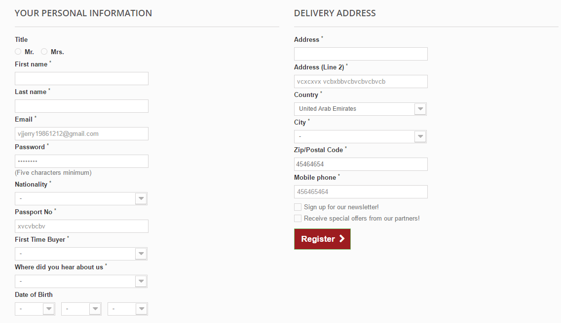 JERRY777 Posted March 17, 2016 Share Posted March 17, 2016 (edited) When a customer or user register I want to capture the address details in one click and save that in ps_address table , ie when he clicks on the register button his address details must be also saved , how to do thisI have managed to customize the registration form and able to plug the address details form to my registration form as shown in the attached image : Now what I am stuck with is : when am clicking on the Register button ,the address field details are not saved in the database and I am getting server error What i tried to do is ,I created a new function called processPostAddress and calling that function from Authcontroller.php page from $this->processPostAddress(); //// custom function call after a customer is created and before redirecting Tools::redirect('index.php?controller='.(($this->authRedirection !== false) ? urlencode($this->authRedirection) : 'my-account')); Below is the custom function which i created public function processPostAddress() { if($this->context->customer->id_customer!=''){ $address = new Address(); $address->id_customer = 40; $address->firstname = trim(Tools::getValue('firstname')); $address->lastname = trim(Tools::getValue('lastname')); $address->address1 = trim(Tools::getValue('address1')); $address->address2 = trim(Tools::getValue('address2')); $address->postcode = trim(Tools::getValue('postcode')); $address->city = trim(Tools::getValue('city')); $address->country = trim(Tools::getValue('country')); $address->state = trim(Tools::getValue('state')); $address->phone = trim(Tools::getValue('phone')); $address->phone_mobile = trim(Tools::getValue('phone_mobile')); $address->add(); // This must add the address to the addresss table when customer registers first time } } Please help me or tell me if am doing anything wrong Edited March 17, 2016 by JERRY777 (see edit history) Link to comment Share on other sites More sharing options...