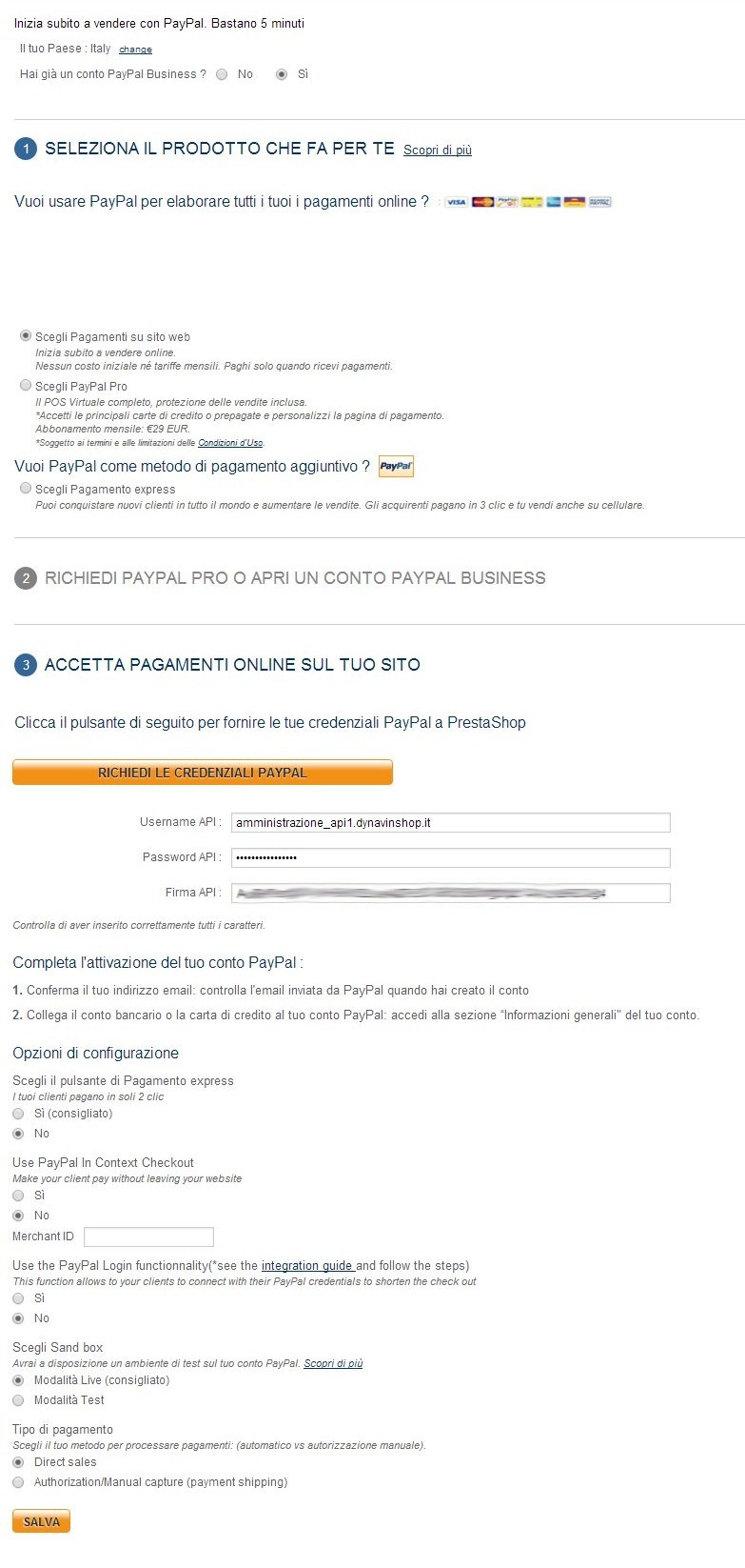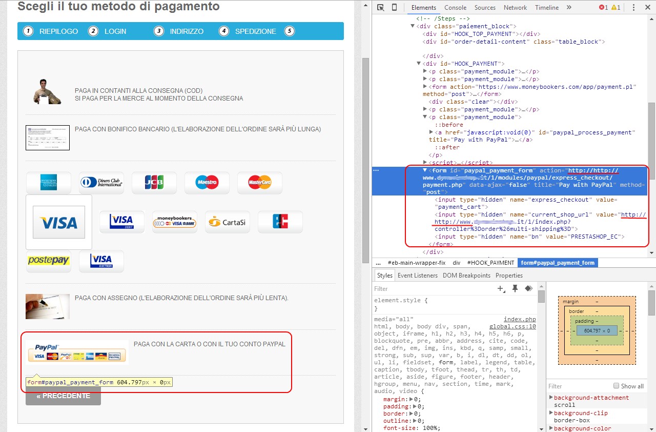 giulio.conte Posted March 17, 2016 Share Posted March 17, 2016 (edited) Salve community, un mio grande amico mio mi ha chiesto un aiuto nel suo e-commerce chiedendomi se lo potevo aiutare a risolvergli un problema nel suo sito, poiché chi gli curava il sito si è trasferito non si sa dove. Premetto: nel sito in questione non è mai stato installato il modulo PayPal come mezzo di pagamento, adesso però c'è ne di bisogno. Per installarlo abbiamo fatto la solita procedura di abilitare il modulo, configurarlo e richiedere le API. (negli altri siti di e-comm mi ha sempre funzionato a primo colpo), questa volta non c'è verso!!!!Il problema sta nel modulo paypal quando si sceglie il pagamento a mezzo PayPal compare la classica schermata grigia di chrome: La pagina web non è disponibile.Vi allego uno screen per i dettagli dell'errore. Contattando direttamente PayPal se ne uscita con questa mail:*****Risposta PayPal Support***** Buongiorno Giulio, c’e qualche problema nel plugin, perché se verifico l’html questo e’ il risultato: <form id="paypal_payment_form" action="http://http://www.dynavinshop.it/1/modules/paypal/express_checkout/payment.php" data-ajax="false" title="Pay with PayPal" method="post"> <input type="hidden" name="express_checkout" value="payment_cart"/> <input type="hidden" name="current_shop_url" value="http://http://www.dynavinshop.it/1/index.php?controller%3Dorder%26multi-shipping%3D" /> penso questo le potrebbe essere utile: https://www.prestashop.com/forums/topic/353908-solution-for-paypal-403-forbidden-error-at-check-out/ ****Fine**** Ok, quindi sostanzialmente il problema sta nel modulo paypal di prestashop, anche perché come si vede dai link: http viene ripetuto più volte. Nell'attesa di ricevere le vostre preziose risposte, colgo l'occasione per mandarvi i miei saluti. Edited March 18, 2016 by giulio.conte (see edit history) Link to comment Share on other sites More sharing options...
