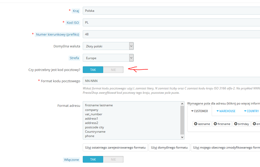 0 Holian Posted May 17, 2019 Share Posted May 17, 2019 W 1.7.5.2 zakładki Miedzynarodowy -> położenie - > kraj -> Polska masz opcje do ustwienia że kod pocztowy jest niewymagany jak na załączonym screenie Link to comment Share on other sites More sharing options...