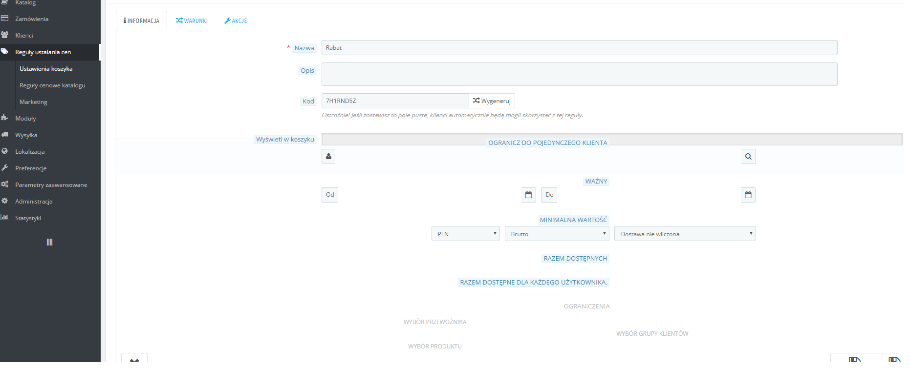 Chciałbym dodać kody rabatowe do mojego sklepu, ale niestety po kliknięciu na Reguły ustalania cen ->Ustawienie koszyka -> Dodaj nową regułę koszyka dziwnie mi się wyświetla.