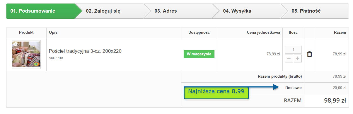 Jak ustawić najniższą cenę dostawy w podsumowaniu zamówienia? Lub nawet ustawić żeby się nie wyświetlała? Mam 6 róznych opcji. Wyświetla sie cena 20 zł a wolałbym aby była 8,99 paczkomaty.