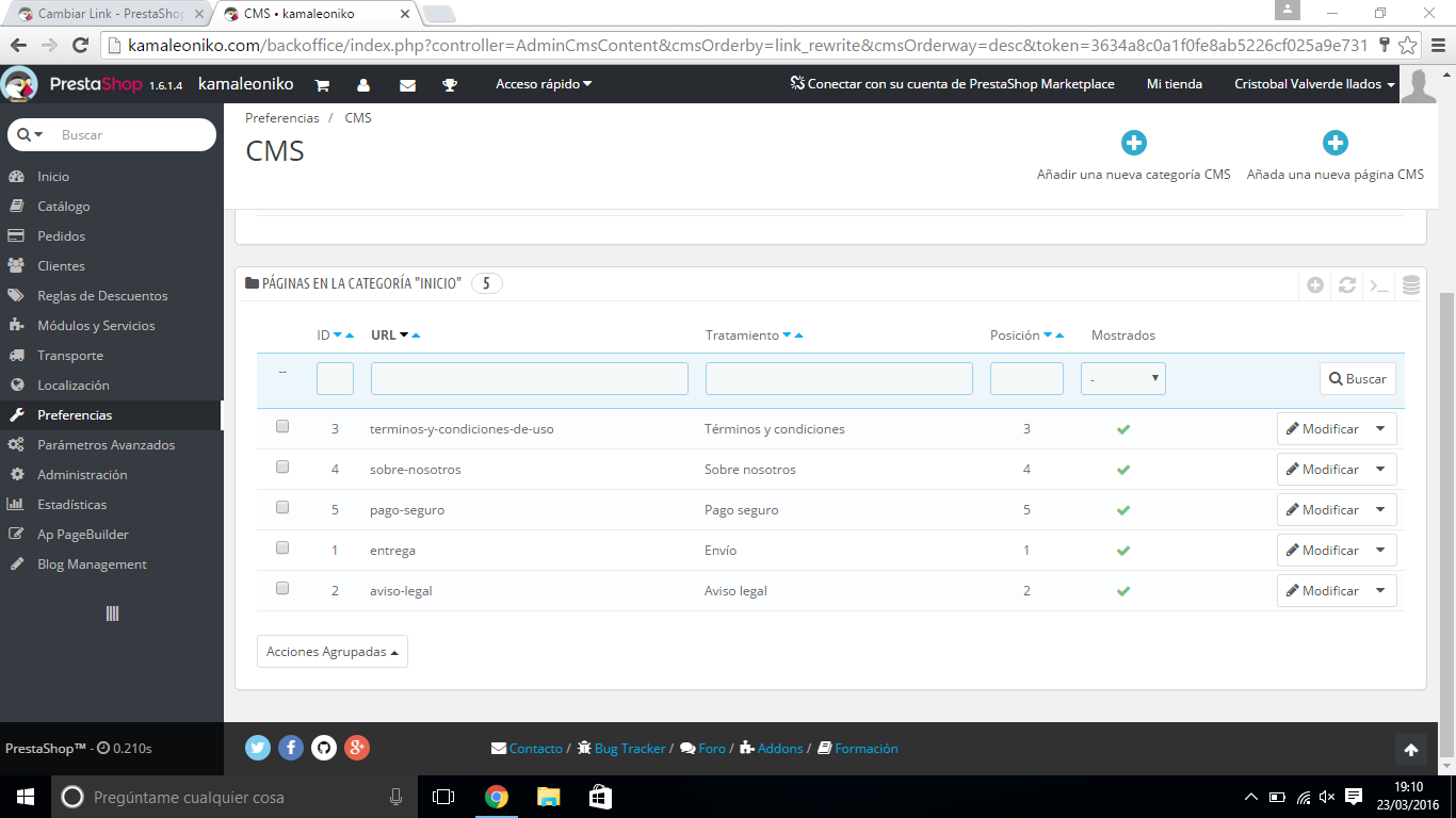 AwesomePX Posted March 25, 2016 Share Posted March 25, 2016 (edited) Buenas por lo que veo no tengo categorias me pone que tengo 0 categorias adjunto imagenes Bueno tienes la Categoría "Inicio" que viene por defecto con prestashop, con ella es suficiente. Tenia el mismo problema que tu, y lo he solucionado de la siguiente manera: En el Back Office ve a Ajustes -> CEO y URL amigables, Ahi en el apartado "esquema del URL" tiene que haber un apartado "re-dirección de la pagina CMS" (o algo parecido) Ahí en teoría te aparece content/{id}-{rewrite} cambialo por esto {id}{rewrite} y debería de solucionar tu problema. Espero serte de ayuda. Saludos Edited March 25, 2016 by AwesomePX (see edit history) Link to comment Share on other sites More sharing options...