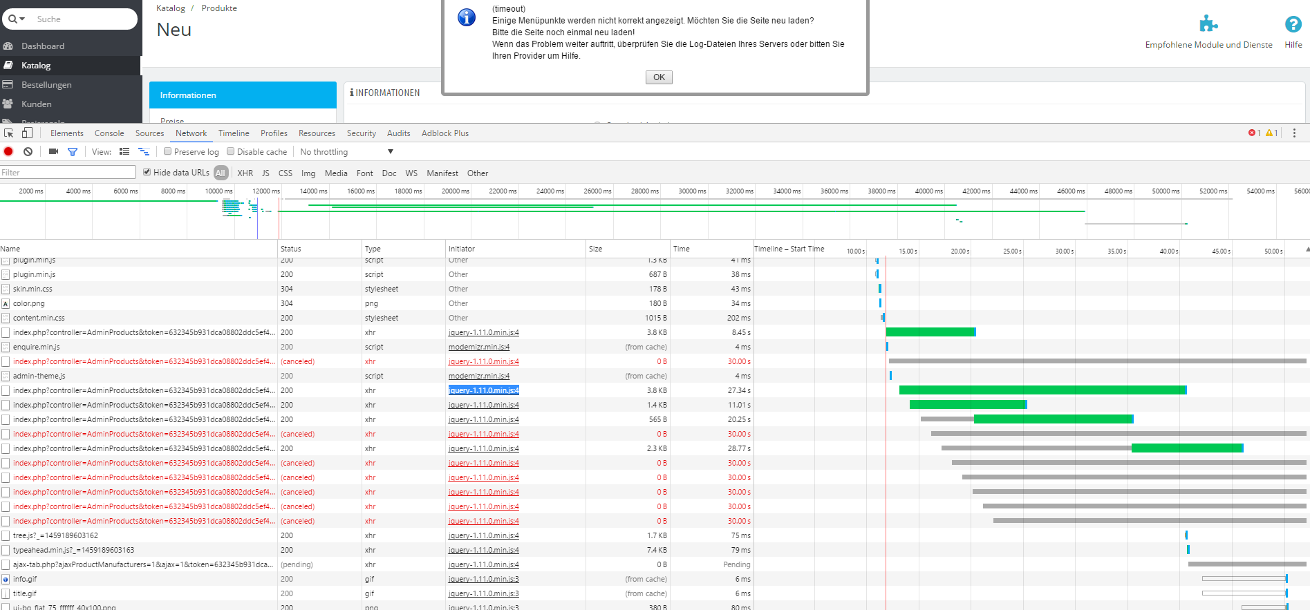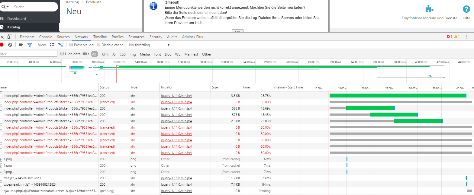 Lausli Posted March 25, 2016 Share Posted March 25, 2016 (edited) Hey, seit 2 tagen habe ich im Backend massive Probleme. Sehr oft "Timeout" Fenster, das einiges nicht geladen werden konnte und sehr oft das ich auf "Speichern" klicke aber nichts passiert. Glaube hat etwas mit javascripts zutun. (timeout) Einige Menüpunkte werden nicht korrekt angezeigt. Möchten Sie die Seite neu laden? Bitte die Seite noch einmal neu laden! Wenn das Problem weiter auftritt, überprüfen Sie die Log-Dateien Ihres Servers oder bitten Sie Ihren Provider um Hilfe. hier nochmal ein Screenshot: Die Datei ist ja da, er kann sie warum auch immer nur nicht laden.... Prestashop 1.6.1.4 mit default theme Edited March 25, 2016 by Lausli (see edit history) Link to comment Share on other sites More sharing options...