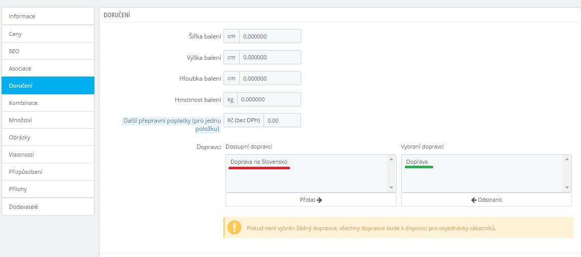 zellenak Posted March 27, 2016 Author Share Posted March 27, 2016 Bohužel to tak nefunguje. Nová doprava (Doprava na Slovensko) zůstane pouze v sekci "Dostupní dopravci" a nepřidá se mezi "Vybrané dopravce". A já bych potřeboval, aby u všech produktů se ta nová doprava dostala do sekce "Vybraní dopravci" a tudíž se zobrazovala při objednávání daných produktů. Jelikož tam mám cca 950 produktů, tak předělávat to produkt po produktu je velmi nepraktické. Link to comment Share on other sites More sharing options...