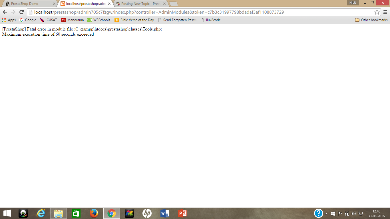 HILU RAJU Posted March 30, 2016 Share Posted March 30, 2016 HAI ALL, I HAVE INSTALLED PRESTASHOP IN MY SYSTEM WITH XAMP SERVER SUCCESSFULLY. BUT WHILE USING ADMIN PANEL, MODULES AND SERVICES OPTION IT IS RESULTING A FATAL ERROR CAN ANYONE HELP TO SORT OUT THE PROBLEM THE ERROR SHOWN IS AS BELOW: [PrestaShop] Fatal error in module file :C:\xampp\htdocs\prestashop\classes\Tools.php:Maximum execution time of 60 seconds exceeded I AM ATTACHING THE SCREENSHOT TOO Link to comment Share on other sites More sharing options...