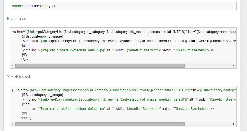 luiscabre Posted March 30, 2016 Share Posted March 30, 2016 Saludos a todos. Espero contar con su ayuda. Tengo la plantilla que por defecto trae Prestashop 1.6.... Tengo un portal en línea y mi cliente me pidio eliminar las imagenes de las marcas que se muestran en la subcategorias que generalmente dicen "IMAGE NO AVAILABLE". En realidad no necesitamos esto...sino que muestre los productos solamente.... Cosegui un código que esta rodando en internet acerca de este problema, el cual esta adjunto a este mensaje....si embargo cuando modifique el archivo category.tpl colocandole {* *} al código igual me sigue apareciendo las imagenes de las marcas....no entiendo porque ....... Alguien puede ayudarme....... le agradezco de antemano. Luis Link to comment Share on other sites More sharing options...