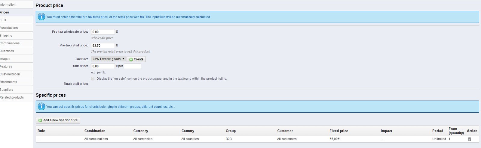 YiannisK Posted March 31, 2016 Share Posted March 31, 2016 Hello, I have a tough one. I have a product with base price 10 and with tax including 12.3€ I also have a group named B2B where the customers have discounted prices without tax and a fixed price (not discounts). B2B group shows prices without tax Default group shows prices with tax So when there is a B2B customer in product.tpl, I want to show Wholesale price: 5€ Suggested retail price: 12.3€ I managed to show the text by identifying the group, but either I enter productPrice or productPriceWithoutReduction I get the same result which is 5€. Can I somehow get the base price of the product? Thanks Link to comment Share on other sites More sharing options...
