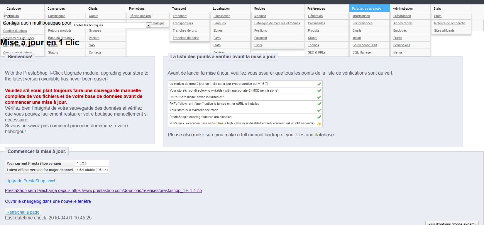 susanne52 Posted April 1, 2016 Share Posted April 1, 2016 Bonjour, j'ai dupliqué un site presta 1.5.2 que je voudrais passer en 1.6. et tester tranquillement avant de mettre à jour le site actuellement en production. J'ai dupliqué la BD, les fichiers, relié les 2, j'ai accès au dashbord d'administration. Bon. J'ai mis à jour le module 1 clic upgrade et là ... bug, le module s'affiche comme sur la capture d'écran jointe et les boutons de mise à jour ou de réglage ne fonctionnent pas. Avez-vous une idée comment régler ce problème ? Merci, Susanne Link to comment Share on other sites More sharing options...