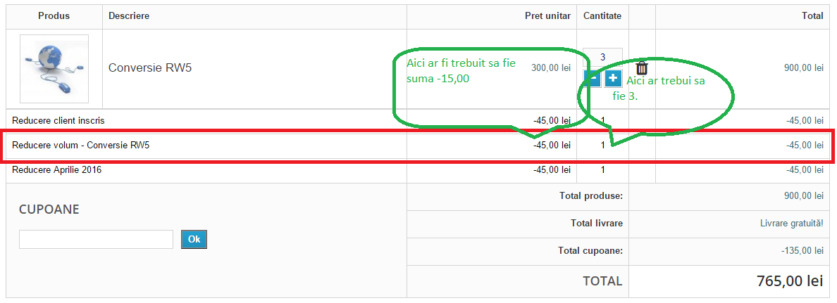 danodas Posted April 2, 2016 Share Posted April 2, 2016 (edited) Salutare. Am o problema majora cu site-ul http://conversiecad.ro si anume ca dupa ce clientii adauga produsele in cod, toate reducerile din detalii cos (banda ce se deruleaza in jos cand am mouse-ul pe cosul de cumparaturi) apar nominal dar cu valoare 0,00 lei. Dupa ce se apasa Plateste, reducerile apar corect ca si suma in detaliile comenzii. Atasez imagine cu problema pe care o intampin: De asemeni in chec-out, daca am 3 produse de acelasi fel cu reducere, reducerea imi apare ca suma totala si cantitate 1. Nu trebuia ssa fie reducerea /unitate si cantitatea astfel incat total reducere=reducere/unitate * cantitatea? Atasez imagine cu aceasta situatie E destul de frustrant deoarece au fost clienti care m-au sunat si mi-au batut obrazul ca ii pacalesc si chiar nu e asa. Daca testati (ceea ce nu pot sa le cer lor) totul e ok si factura contine aceste reduceri, dar pana acolo... clientul e stapan. Multumesc pentru ajutor sau pareri. Edited April 2, 2016 by danodas (see edit history) Link to comment Share on other sites More sharing options...