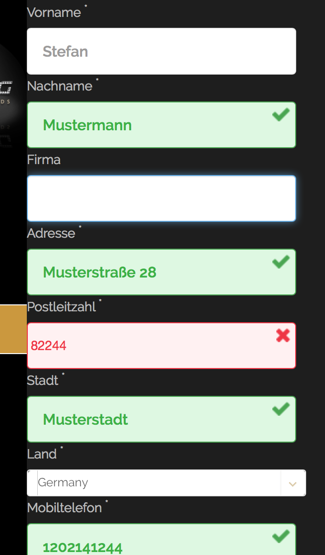 0815shop Posted April 2, 2016 Share Posted April 2, 2016 Hallo, weiß jemand von Euch wie die PLZ Prüfung funktioniert? Ich kann bei mir im Bestellverlauf eingeben was ich will, egal welche Zahlenkombi, egal ob 4,5 oder 6-stellig. Ich bekomme immer ein rotes Kreuz das die Eingabe falsch ist. Witzigerweise übernimmt er aber die Bestellung, es handelt sich also nur um einen Schönheitsfehler. Allerdings macht das beim Kunden keinen guten Eindruck, daher wäre ich sehr dankbar wenn ich diese Prüfung grün bekomme. Anbei ein Screenshot. Shop ist 1.6.1.4 mit dem Template "Craft" aus dem Presta Addon Shop. Link to comment Share on other sites More sharing options...