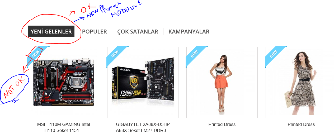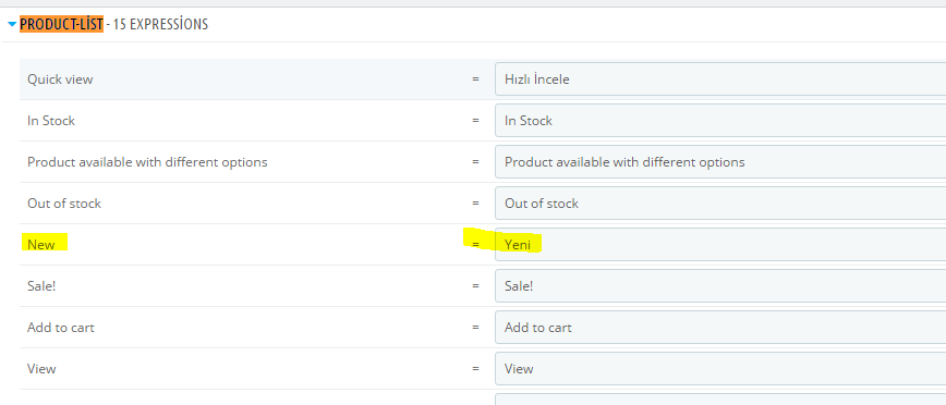 sametkk Posted April 3, 2016 Author Share Posted April 3, 2016 Just go to Localization > Translations > Type of translation > Front office translations > select your theme and language > click Modify > on list find PRODUCT-LIST > click to expand it if it's not and change "new" to your own text. Thanks a lot for your kind help. But this setting doesn't change "new" line on the home page. the settings only current for product page. For not home page. Summary, product list page ok but home page not ok. Link to comment Share on other sites More sharing options...