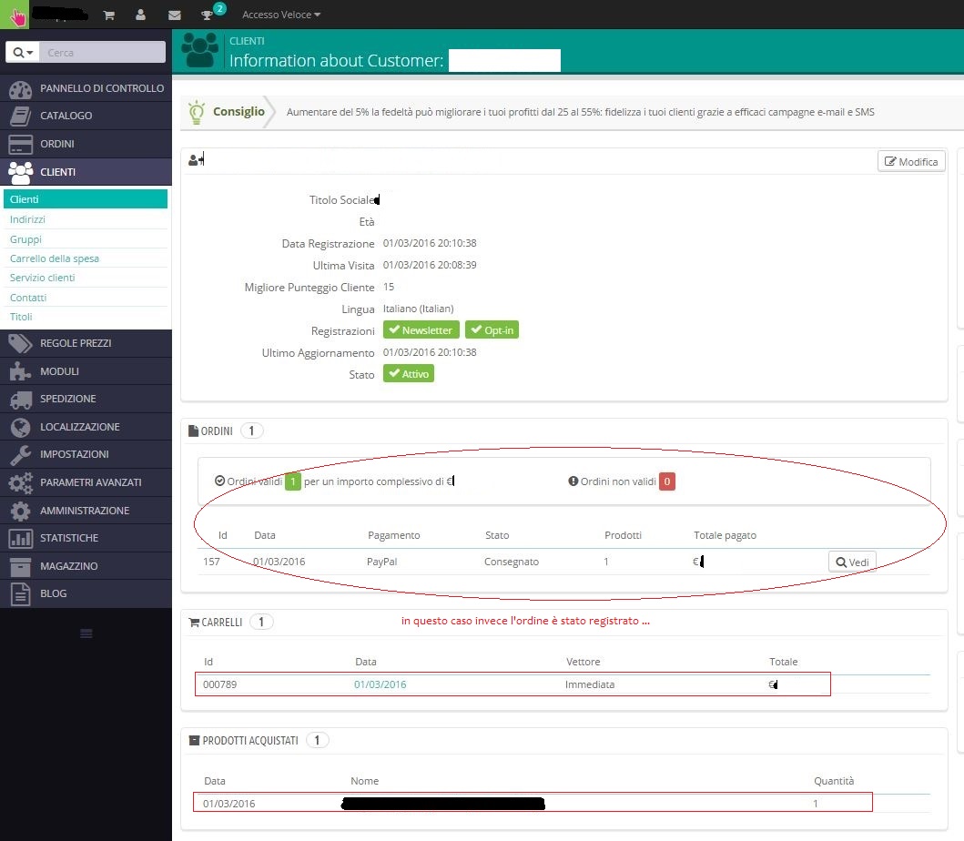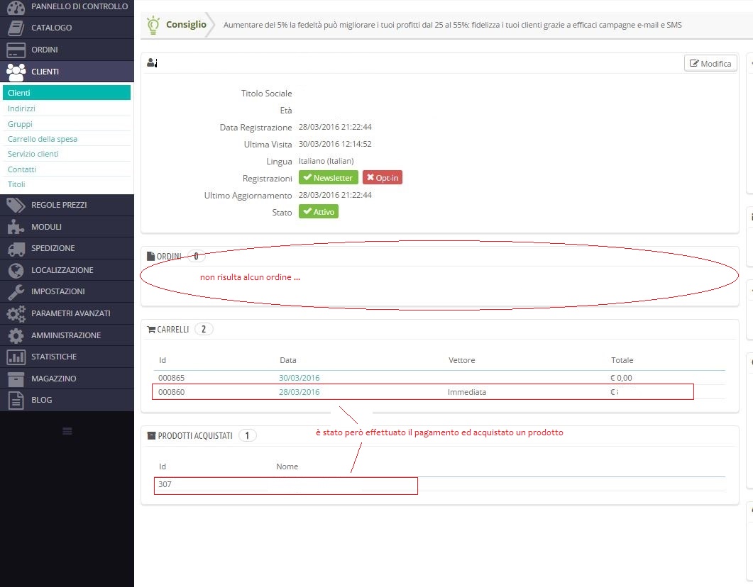 ellittle Posted April 4, 2016 Share Posted April 4, 2016 Buondì a tutti!Spero che qualcuno possa aiutarmi perché sono in alto mare. E' da un mese circa che quando un cliente acquista sul mio sito tramite Paypal, Prestashop non registra l'ordine e non mi da notifica dello stesso, anche se, andando sotto la scheda del cliente acquirente, mi risulta l'oggetto comprato e il pagamento effettuato e ricevuto. Come posso risolvere il problema?? Può derivare dal fatto che i clienti siano o meno registrati sulla piattaforma?Allego screenshot. Link to comment Share on other sites More sharing options...