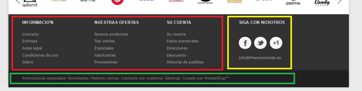 Anothnio Posted April 4, 2016 Share Posted April 4, 2016 Buenas, Quiero cambiar el orden/número de los enlaces de esta parte del footer: La parte marcada como Verde veo que se puede configurar en el módulo "Bloque CMS" en la sección "Configuración de los links CMS a pie de página". La parte marcada como Amarilla veo que se puede configurar también en otro módulo. La parte marcada como Roja no encuentro dónde configurarla, en un principio supuse que se configuraba también dentro del módulo "Bloque CMS" en la sección "Configuración de los bloques CMS" pero me la crea en la izquierda, no abajo como yo quiero. Lo otro que he buscado sería cambiar el fichero "www\modules\wpfooterlinks\wpfooterlinks.tpl" para que muestre la cantidad y los enlaces que yo quiera (aunque lo que veo en el foro es cambiar cosas a la ruta "modules/cmsblock") ¿Hay alguna forma de hacerlo desde el backoffice de manera "configurable" o tengo que entrar a tocar código? ¿En caso de código... wpfooterlinks o cmsblock? Muchas Gracias por vuestro tiempo, Usando: PrestaShop™ 1.5.2.0 y un theme Link to comment Share on other sites More sharing options...