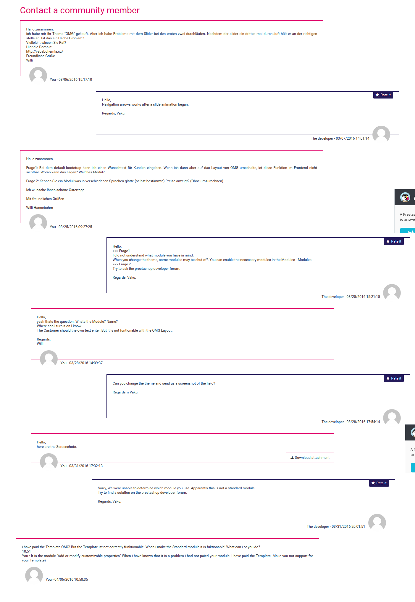 0 PEP-Willi Posted April 6, 2016 Author Share Posted April 6, 2016 Soeben bekahm ich diese Nachricht vom Programmierer. We do not support prestashop or third-party extensions.Support is limited to questions regarding the theme’s features or problems with the theme.Regards, Vaku. Was kann ich tun?Das Forum schickt mich zur Hersteller des Themes OMG - http://amafino.com/shop Hätte ich deren Seite vorher gesehen hätte ich das Modul nicht gekauft! Und der Hersteller wieder zurück mit der Aussage von oben. Kann mir denn keiner sagen wo es klemmen könnte? Bzw. welches Modul es sein könnte? Link to comment Share on other sites More sharing options...