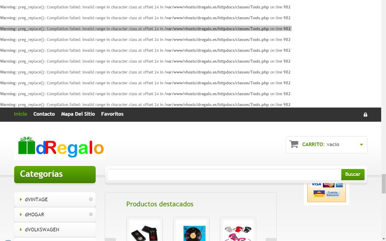 dregalo Posted April 7, 2016 Share Posted April 7, 2016 Buenos días, Estoy teniendo un error en mi tienda y es que al entrar en "ver mi tienda" me aparece en la cabecera una línea de warning de error repetidas por lo menos 30 veces. En concreto pone esto: Warning: preg_replace(): Compilation failed: invalid range in character class at offset 24 in /var/www/vhosts/dregalo.es/httpdocs/classes/Tools.php on line 982 Luego ya, debajo, se ve la tienda sin problemas pero claro la primera imagen es este warning repetido muchas veces. Por favor, alguien me puede ayudar en cómo quitar estas líneas??. Solo aparecen en la tienda no en el plesk. Adjunto un pantallazo para que veaís.. Gracias Link to comment Share on other sites More sharing options...