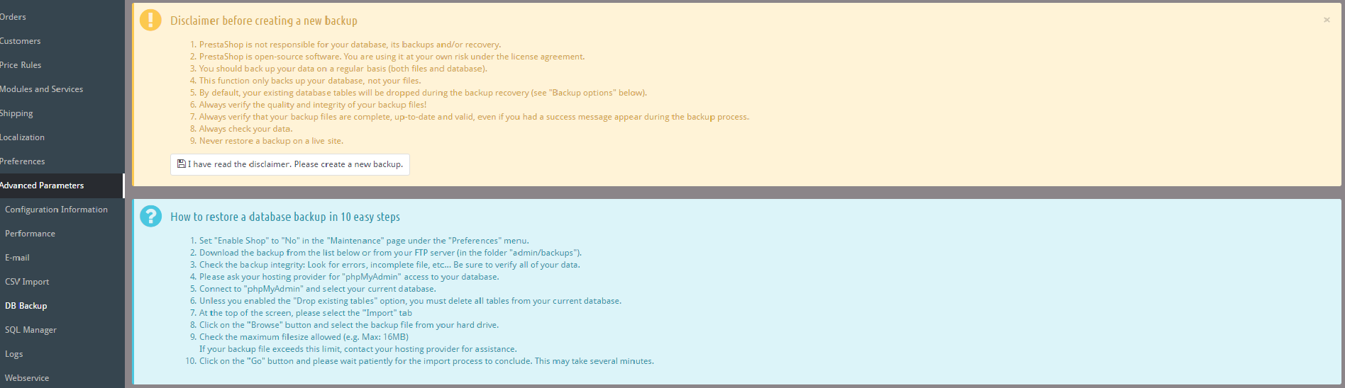 lorenzho Posted April 11, 2016 Share Posted April 11, 2016 Advanced Parameters -> DB Backup -> Neem ik aan, het download een backup file van je huidige prestashop en je kan het ook weer importeren Link to comment Share on other sites More sharing options...
