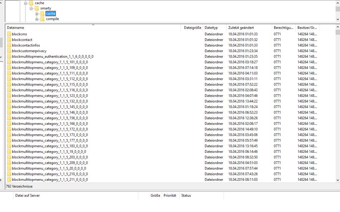 megaguenstig Posted April 18, 2016 Share Posted April 18, 2016 Wollte mal was fragen ich habe im smarty/cache 792 verzeichnisse und im smarty/compile 91 stück, ist das normal, schaut mal das bild an, besonders im cache, der war sonst nie so voll, vorallem blockmultitopmenu_category_1_1_5_123_0_0_0_0... weiss jemand hier was man machen könnte? im backend ist es so eingestellt: Template-Kompilierung Template-Dateien nie neu kompilieren Cache JA Cache Typ Dateisystem Cache löschen Cache niemals leeren Cache nach jeder Änderung löschen Cache verwenden NEIN Link to comment Share on other sites More sharing options...