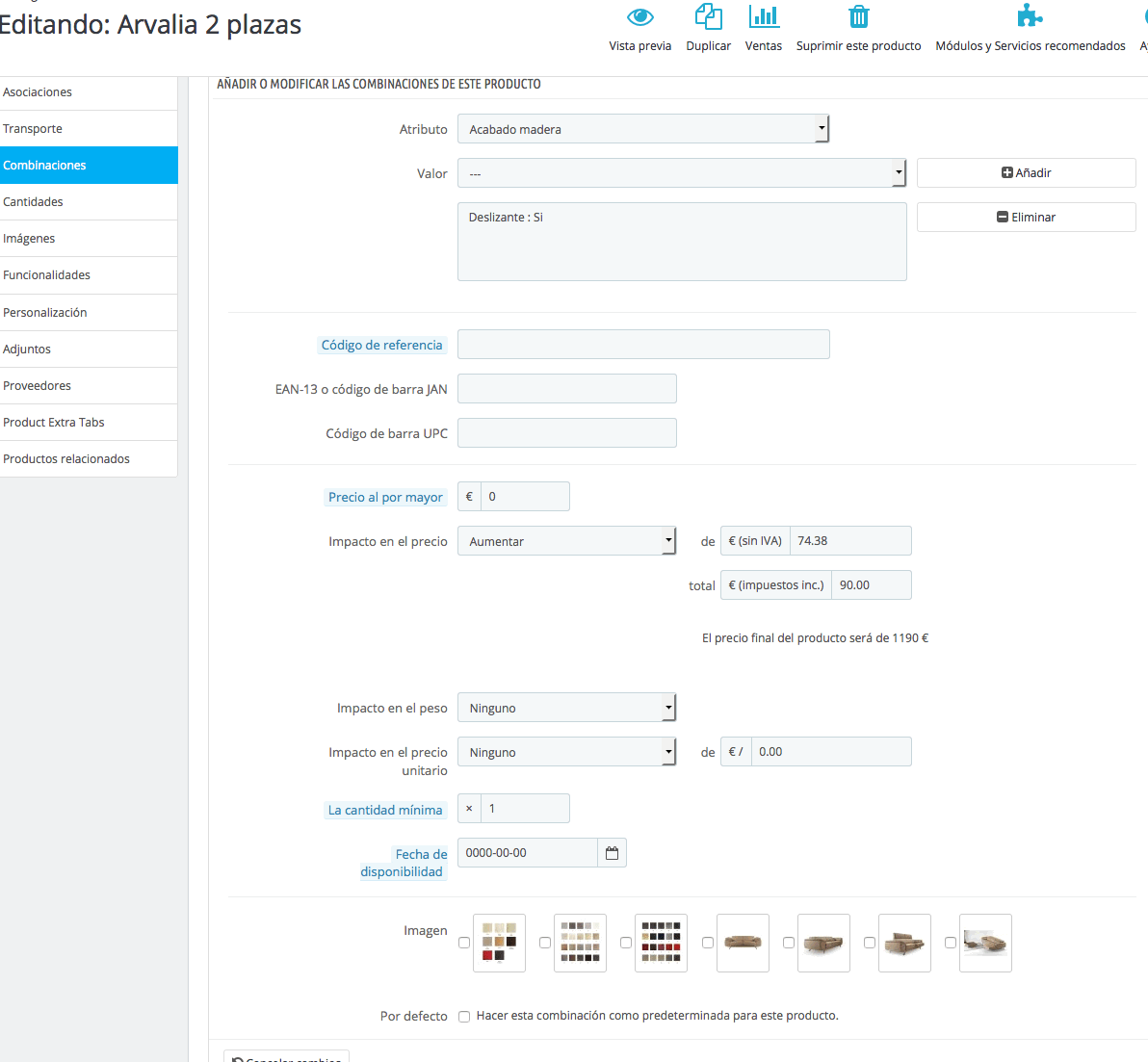 Añado un primer atributo con diferentes valores (telas diferentes). Cada cual con su impacto en el precio. Todo correcto.