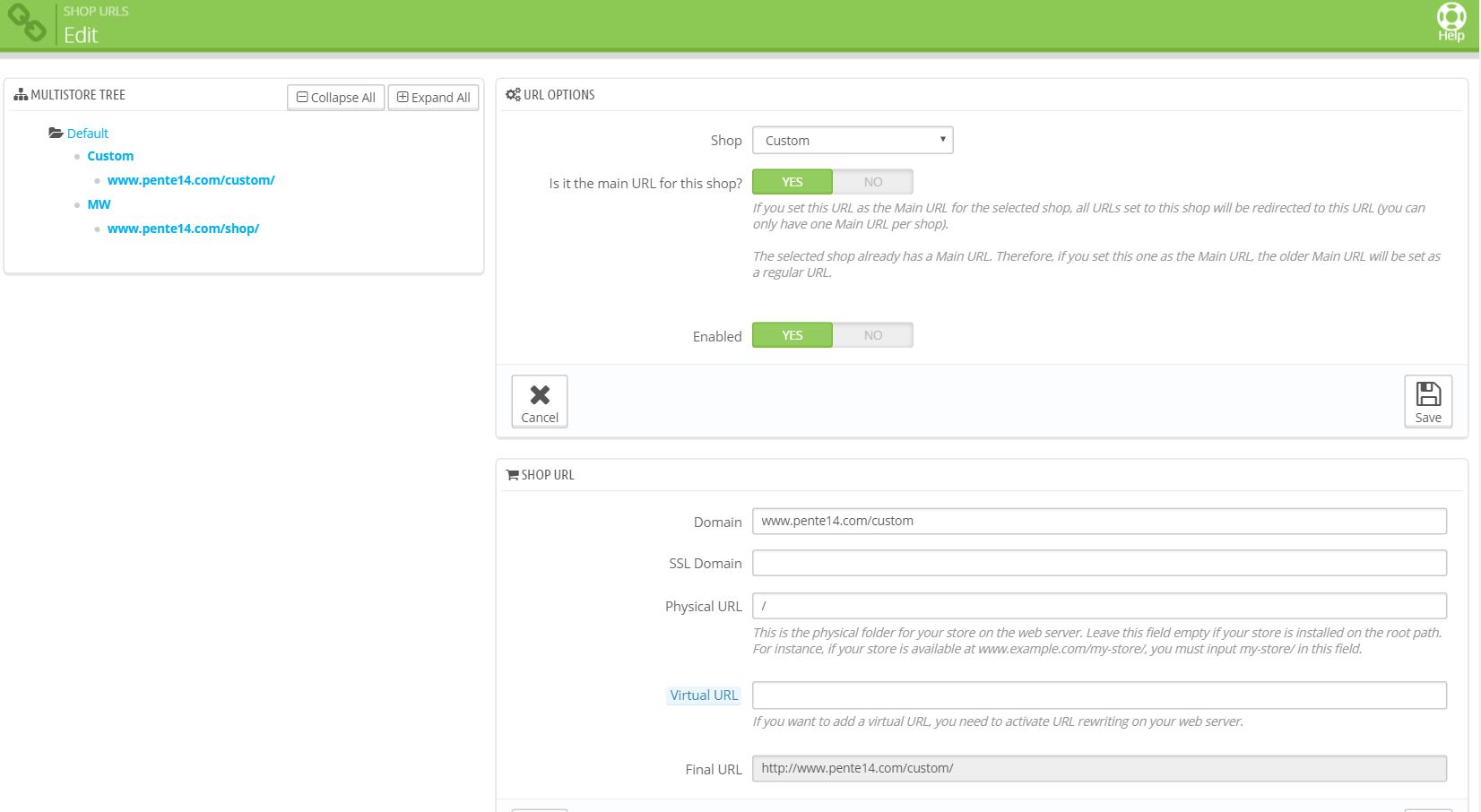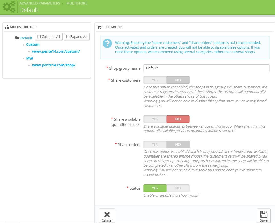 Pente14 Posted April 22, 2016 Author Share Posted April 22, 2016 if you want create a separated PrestaShop store, you can just install under its any sub-folder. but it will be completely different store with different database. If you want to use mutistotre feature, then you will need enable multistore feature. you not need install a separated files or folders. it will be virtual directory - virtual URL. Once again thanks for your help However, I want the multistore feature but it is not activating. It is enabled. I have configured the advanced parameters. The new shop is showing in the tree. No URL or directory has been generated Link to comment Share on other sites More sharing options...