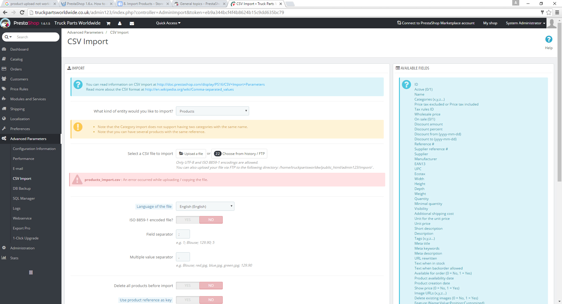 norsk-global Posted April 21, 2016 Share Posted April 21, 2016 Hello, Any help with this would be grateful. I have not found anything else on the forum that is similar. I have just upgraded to Prestashop 1.6.1.5. However, I have made a few product uploads on this version already. Everytime that I attempt to upload my products .csv file I get an error: products.csv: An error occurred while uploading / copying the file I have attempted uploading different .csv files with the same result for both products and categories. There was no issue a few days ago. I have attempted to upload the same file now, but I received the same error. I was able to load an old product import .csv file on the ftp. But when opening the new file from the ftp there was no error, but at the next step the .csv contained no information. I am using Apache Open Office Calc to make the .csv I have attempted saving the .csv in notepad and Excel - no luck. Link to comment Share on other sites More sharing options...