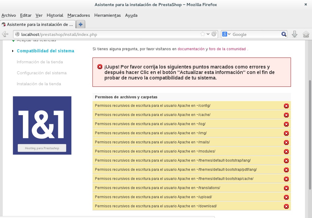 Presti_oscaringas Posted April 23, 2016 Share Posted April 23, 2016 Hola a todos. Soy un novato en Prestashop y me he decidido a probar esta aplicación para montar una pequeña tienda online. Me han recomendado que lo haga sobre un servidor web linux y ahora lo estoy haciendo en una máquina local antes de subirla a un servidor. Tengo montado el servidor Web bajo un Fedora 20. Ya tengo todo instalado y funcionando (apache, mysql y php) y me disponía a realizar la instalación de Prestashop cuando me ha dado un montón de errores que podéis ver en el archivo adjunto. Lo primero que he pensado es que podría ser un problema de permisos sobre el usuario apache ya que los archivos los he copiado con el usuario root al directorio /var/www/html pero para asegurarme de que no fuera problema de permisos he hecho un chmod -R 777 /var/www/html y me sigue dando todos esos errores. ¿Alguien me puede decir a qué puede ser debido? Gracias :-). Link to comment Share on other sites More sharing options...