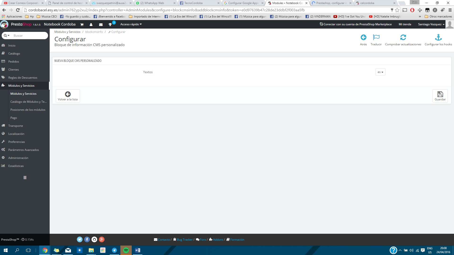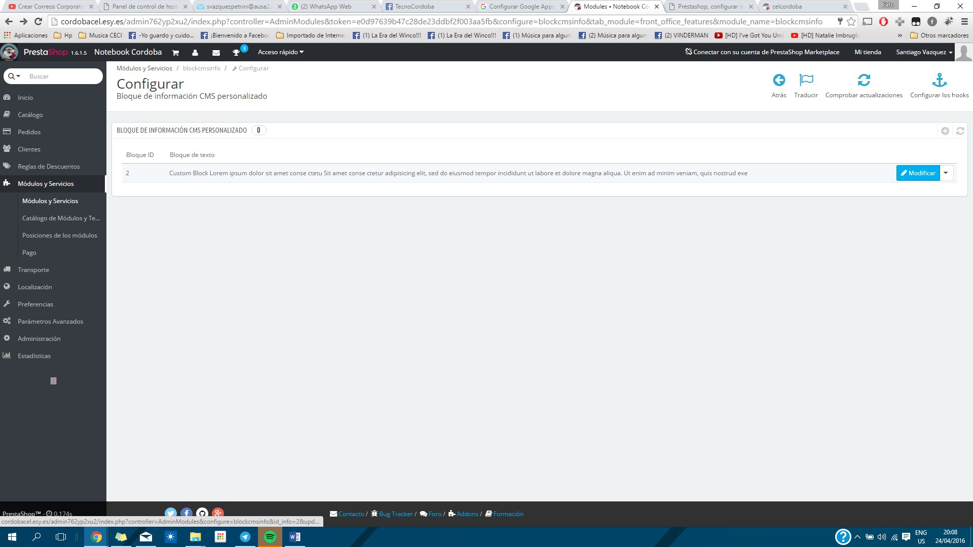 LyL Desarrollo Posted April 25, 2016 Share Posted April 25, 2016 Ese bloque que quieres modificar es el que sale abajo junto a la ventana de tu facebook (si es qu elo tienes habilitado) Si lo que quieres modificar son las paginas CMS, lo debes hacer desde Preferencias > CMS Link to comment Share on other sites More sharing options...