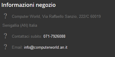ciao caro amico mio devi imparare ad usare i moduli di prestashop, che versione hai installato? devi entrare in: Blocco informazioni CSM personalizzato il modulo lo trovi in moduli funzionalità del fron office, ATTENZIONE le scritte sono fatte in CSM che è un liguaggio di programmazione se ti metti a scrivere a caso come in un prog, di word si cancelleranno i simboli che sono all'interno! a meno che non sei uno sviluppatore allora ok! per quanto riguarda le informazioni di contatto sono inseribili in vari moduli di cui ora non ti elenco ciao!