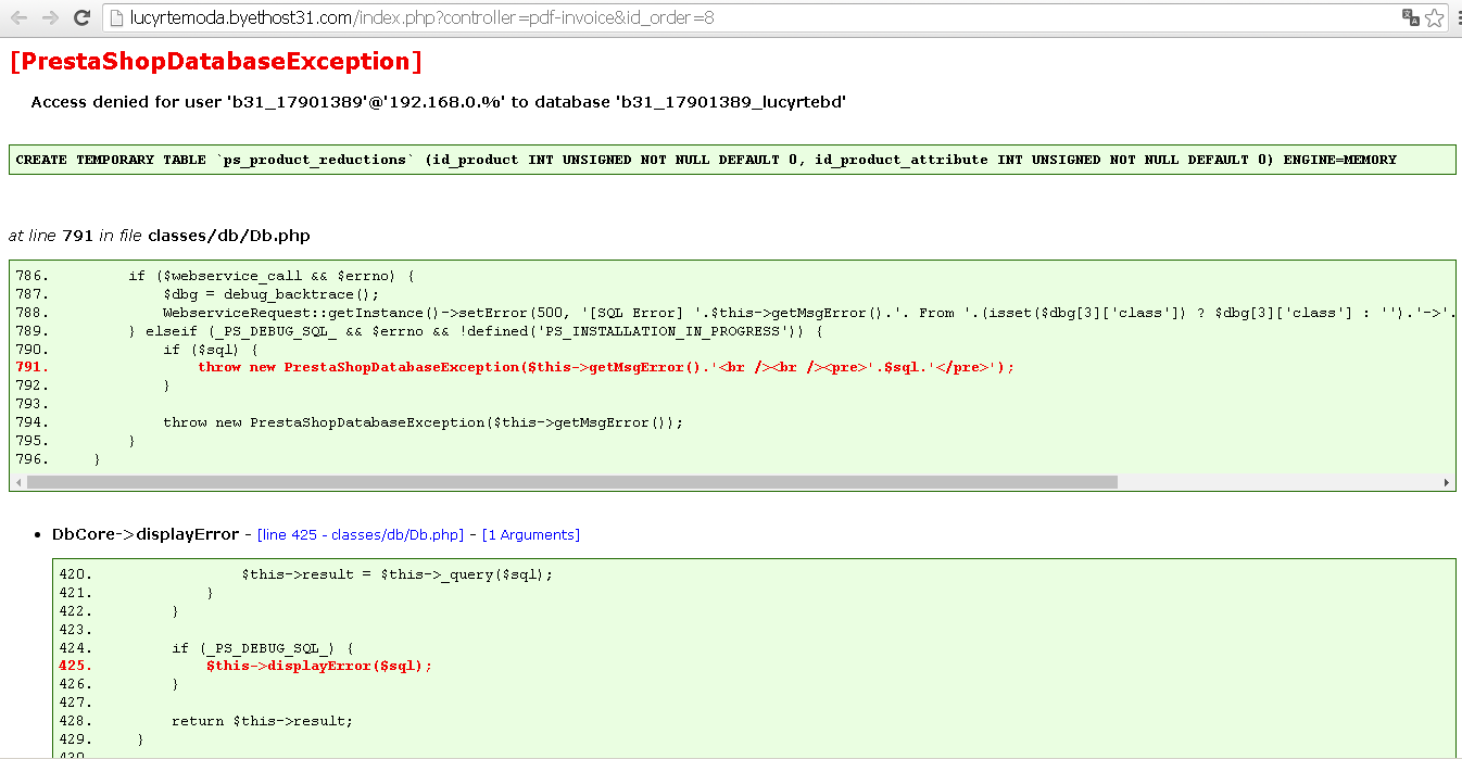 juanes2122 Posted April 27, 2016 Share Posted April 27, 2016 (edited) Trabajaba en mi página de presta Shop en local host, cuando la pase a un hosting me manda el siguiente error: PrestaShopDatabaseException] Access denied for user 'b31_17901389'@'192.168.0.%' to database 'b31_17901389_lucyrtebd' CREATE TEMPORARY TABLE `ps_product_reductions` (id_product INT UNSIGNED NOT NULL DEFAULT 0, id_product_attribute INT UNSIGNED NOT NULL DEFAULT 0) ENGINE=MEMORY El error sale cuando intento generar una factura (Descargarla) y tambien cuando paso al proceso de pago por medio de Universal pay.(El error para ambos, es exactamente idéntico.) el link de la pagina es: lucyrtemoda.byethost31.com Agradecería muchísimo cualquier ayuda. Edited April 27, 2016 by juanes2122 (see edit history) Link to comment Share on other sites More sharing options...
