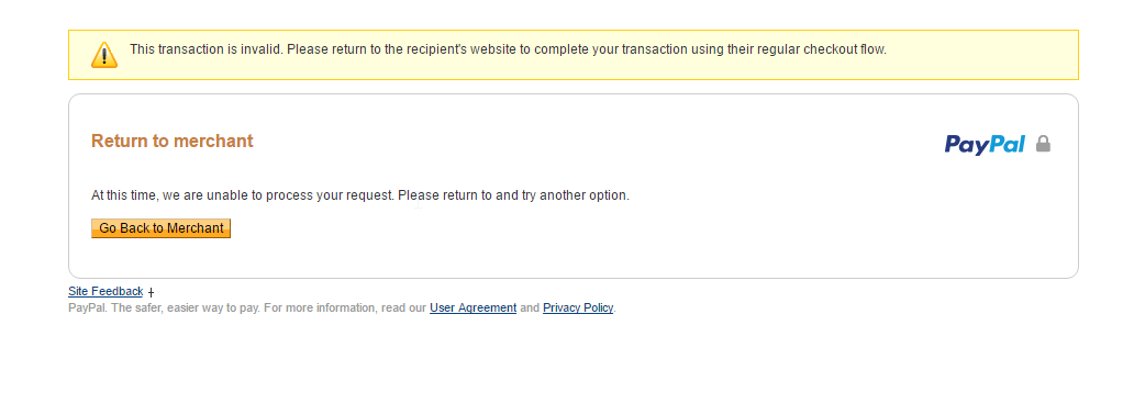 "This transaction is invalid. Please return to the recipient's website to complete your transaction using their regular checkout flow."