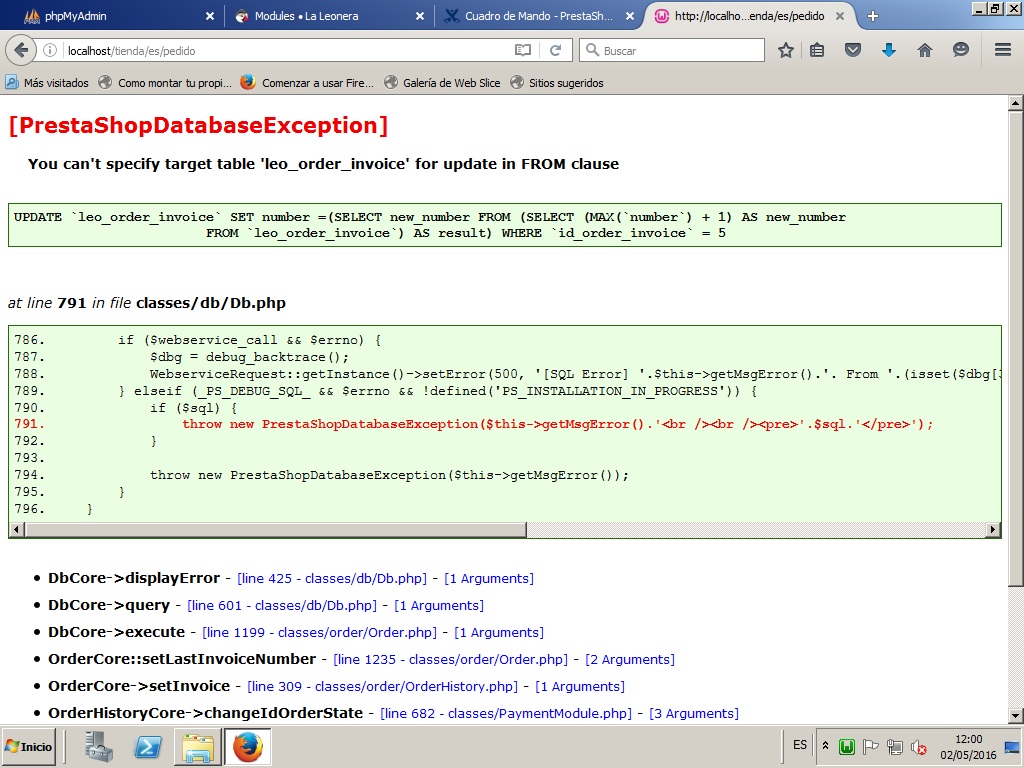 anlemoproyect Posted May 2, 2016 Share Posted May 2, 2016 Hola, cuando hago un pedido en mi tienda todo se procesa bien, recibo un correo con el pedido y demás, pero me salta este error. (por si acaso lo copio que creo que se ve muy pequeño) You can't specify target table 'leo_order_invoice' for update in FROM clause UPDATE `leo_order_invoice` SET number =(SELECT new_number FROM (SELECT (MAX(`number`) + 1) AS new_number FROM `leo_order_invoice`) AS result) WHERE `id_order_invoice` = 5 at line 791 in file classes/db/Db.php 786. if ($webservice_call && $errno) { 787. $dbg = debug_backtrace(); 788. WebserviceRequest::getInstance()->setError(500, ' '.$this->getMsgError().'. From '.(isset($dbg[3]['class']) ? $dbg[3]['class'] : '').'->'.$dbg[3]['function'].'() Query was : '.$sql, 97); 789. } elseif (_PS_DEBUG_SQL_ && $errno && !defined('PS_INSTALLATION_IN_PROGRESS')) { 790. if ($sql) { 791. throw new PrestaShopDatabaseException($this->getMsgError().'<br /><br /><pre>'.$sql.'</pre>'); 792. } 793. 794. throw new PrestaShopDatabaseException($this->getMsgError()); 795. } 796. } Link to comment Share on other sites More sharing options...