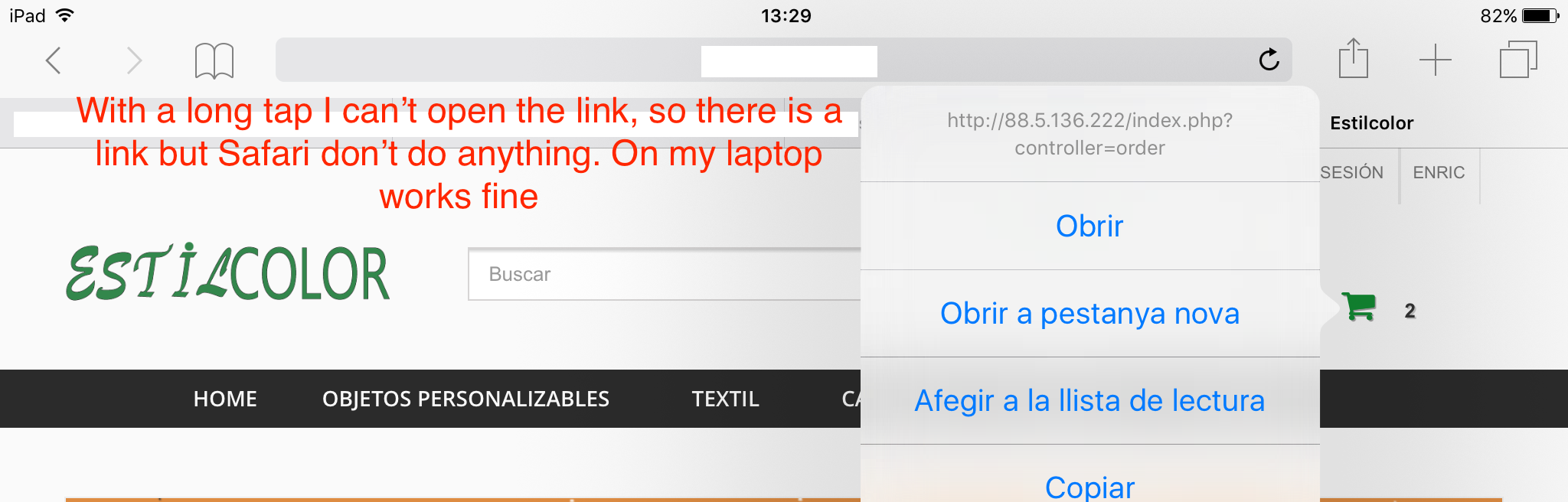 I'm testing a site where the cart button works fine on my laptop in a different resolutions, but when I test on my tablet happens nothing: If I make a long tap I can open the link but on a single tap no. I attach some images to explain my self.