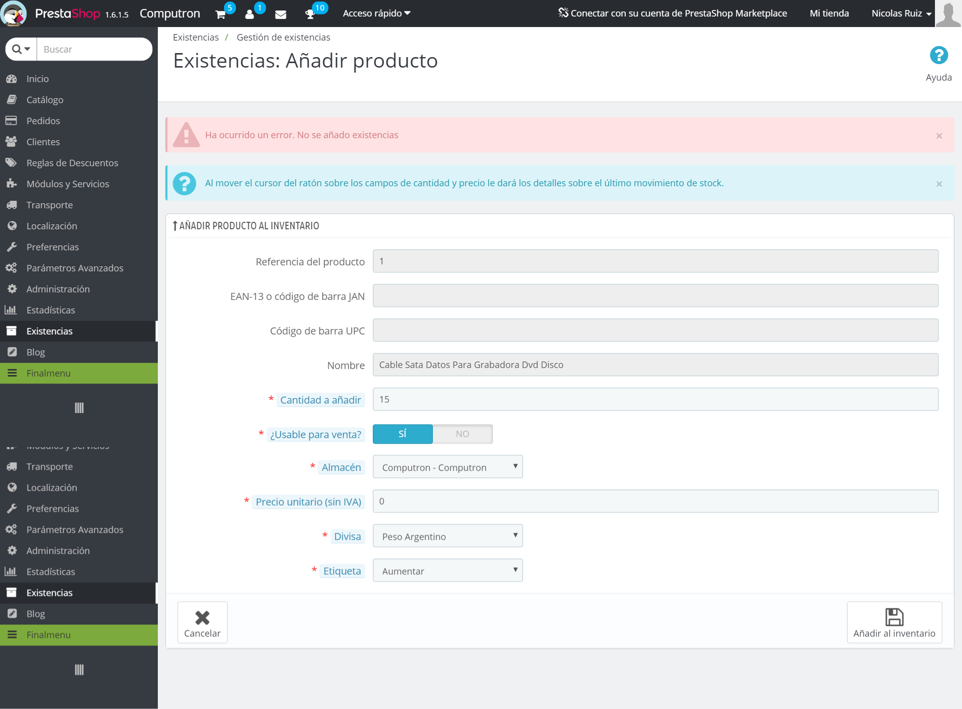 FractalDs Posted May 3, 2016 Share Posted May 3, 2016 Buenas noches, estoy teniendo otro problema y ahora con el tema de las existencias. Al querer añadir una existencia de un producto me tira el siguiente error: Ha ocurrido un error. No se añado existencias Adjunto captura de pantalla. Aguardo algun comentario. Gracias nuevamente! Link to comment Share on other sites More sharing options...