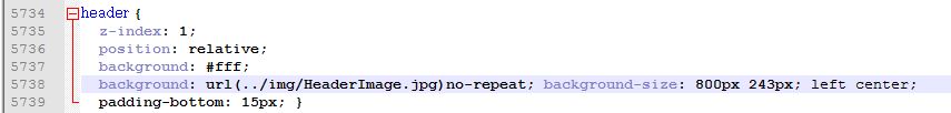 endriu107 Posted May 10, 2016 Share Posted May 10, 2016 I'm not sure what you exacly want but I think in line 5734 you could try put this: header { z-index: 1; position: relative; background: #fff; background: url(../img/HeaderImage.jpg); background-repeat: no-repeat; background-size: cover; padding-bottom: 15px; } Link to comment Share on other sites More sharing options...