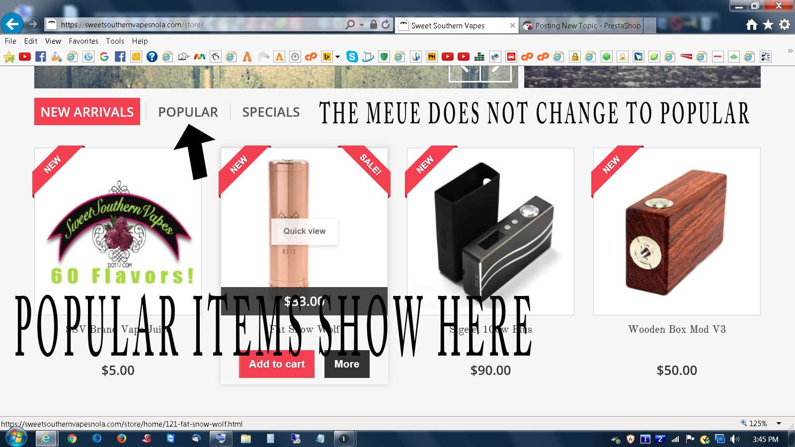 ssvapes Posted May 7, 2016 Share Posted May 7, 2016 Hi everyone, I'm stuck on a problem and was hoping someone could help. I changed 'new arrivals' to 'popular items' on the front page. The 'popular items' show up. However, the menu stays on 'new arrivals'. I tried changing the sort order. Is this a bug? Anyone know how to change the default menu highlight? I have attached a pic Any help would be appreciated. Link to comment Share on other sites More sharing options...