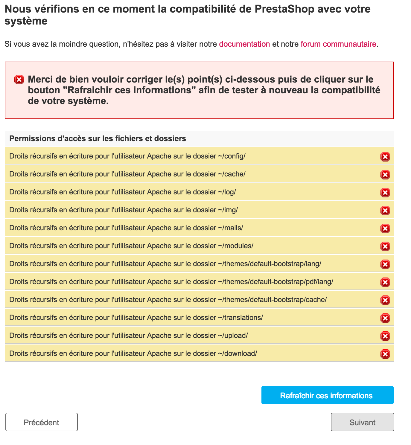 Sami Aibeche Posted May 8, 2016 Share Posted May 8, 2016 Hello Voilà, je suis plutôt novice avec Prestashop et je suis tombé sur un soucis dans l'installation de celui-ci : - Téléchargement de Prestashop 1.6 - Prestashop décompressé et placé dans le dossier www - Installation de Prestashop - ? Je suis sous Mac et je saisis pas trop le problème d'accès aux dossiers/fichiers étant donné que je suis en local... Si quelqu'un à une ligne de commande ou la solution à ça ce serait top Merci d'avance Link to comment Share on other sites More sharing options...